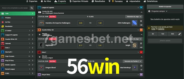 O 56win oferece uma grande seleção de opções de apostas em e-sports com probabilidades competitivas